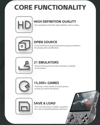 The R36S is a handheld retro gaming console that lets you enjoy classic games from over 10+ different gaming platforms like NES, SNES, PS1, and more. It's compact, portable, and comes preloaded with hundreds of nostalgic titles.